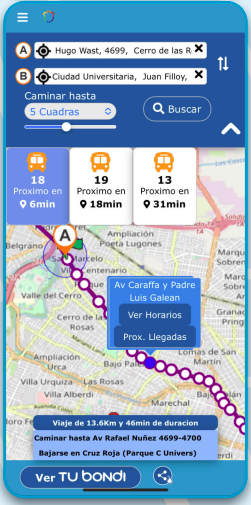 De no haber buses en el sentido de marcha, la aplicación te mostrará el tiempo programado de acuerdo al diagrama. En todos los casos podrás visualizar la parada de ascenso más cercana, y el camino a recorrer a pie.
